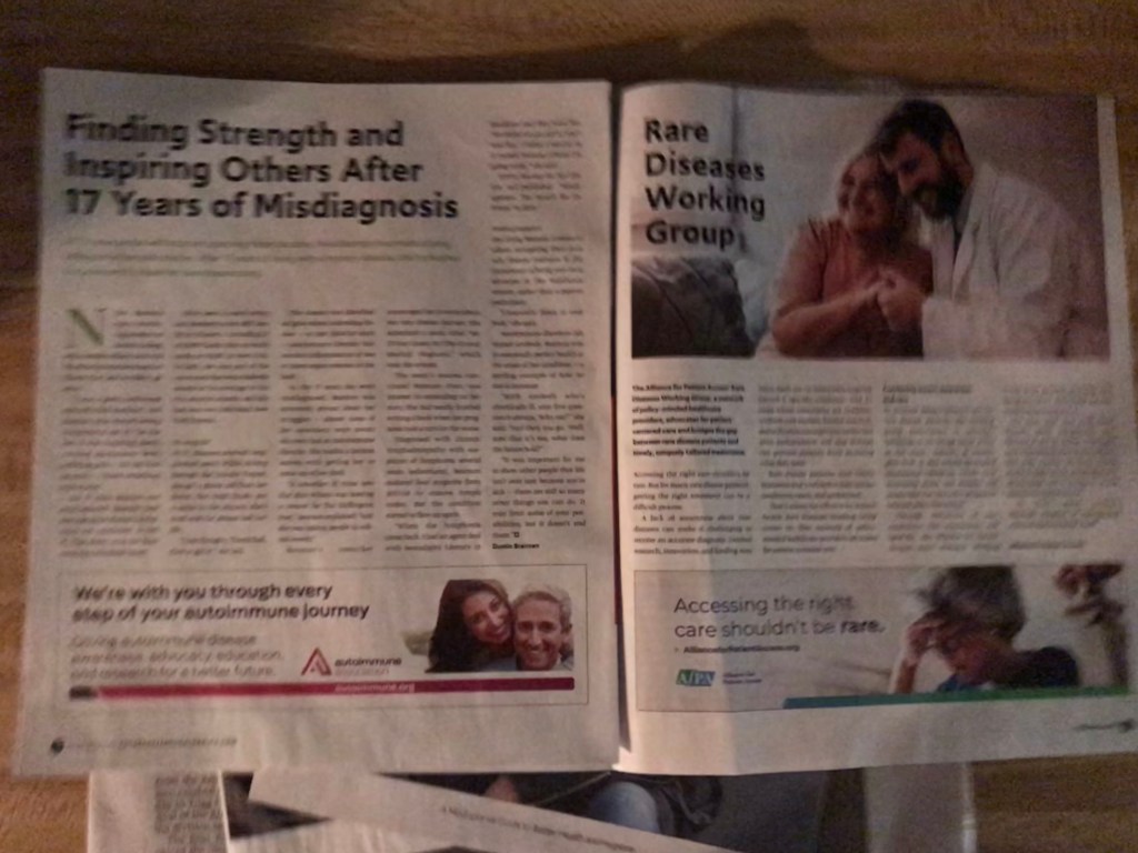 The article is also published on a website (https://www.futureofpersonalhealth.com/rare-diseases/finding-strength-and-inspiring-others-after-17-years-of-misdiagnosis/amp/). But, I wanted to hold it my hands. I realize now there’s a rush you get when you flip the pages of an actual paper and see your name in print. It’s the same one I had when I got my first byline or published my first book. I made me feel official. I missed that feeling.